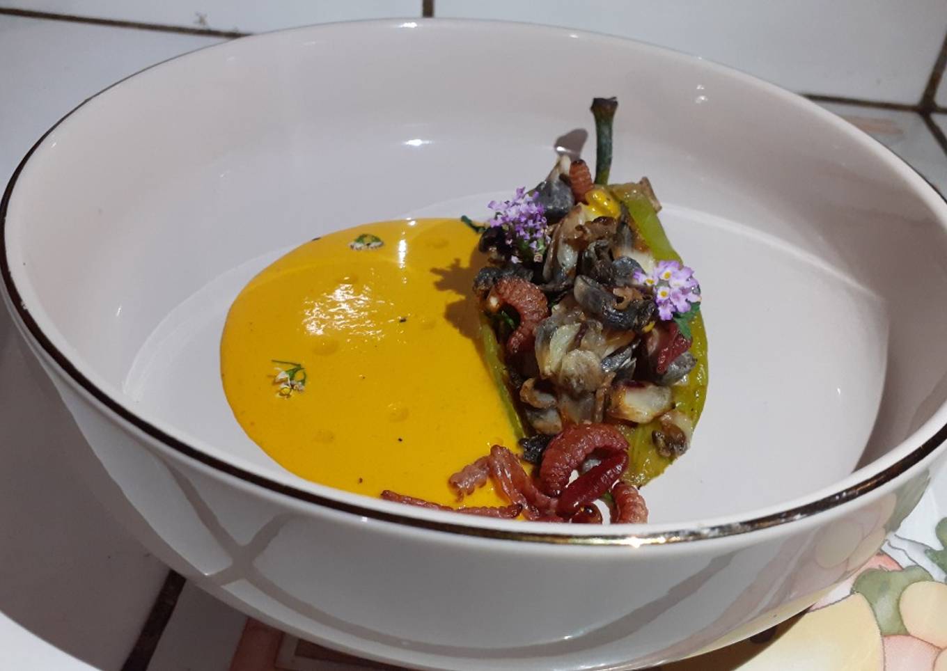 - Una vez terminado todo, proceder a montar el plato: hacer un espejo de crema de pimientos y poner el chile de agua relleno. Decorar con flores comestibles, aceite de oliva y gusanitos de maguey.