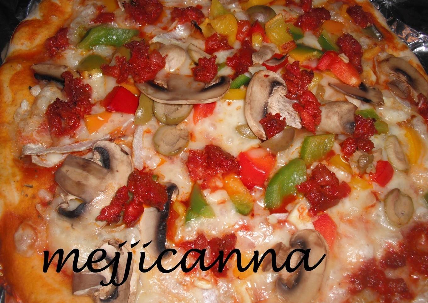 Pizza con salsa de tomate, pimientos rojos y verde, champiñones, calabacín y aceitunas negras por encima, se condimenta con orégano, albahaca, tomillo, sal y pimienta.