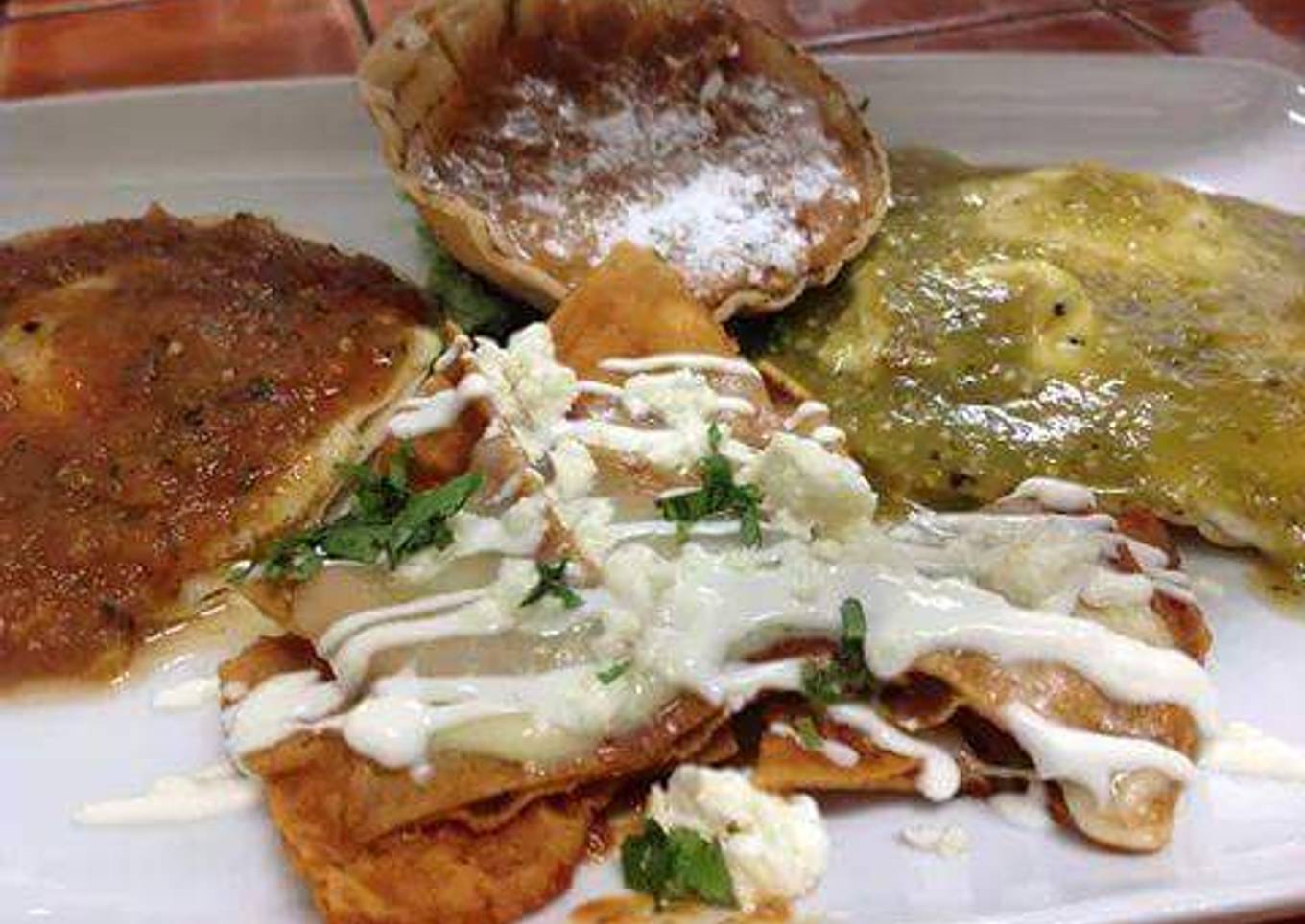 - Una vez montado todo esto, se agarra un bowl en el cual se tiran las tortillas doradas en triángulo se bañan y se saltean con el sobrante de la salsa roja, una vez bañadas se montan por un lado del plato y se les tiran queso oreado revuelto con cilantro y cebolla blanca.