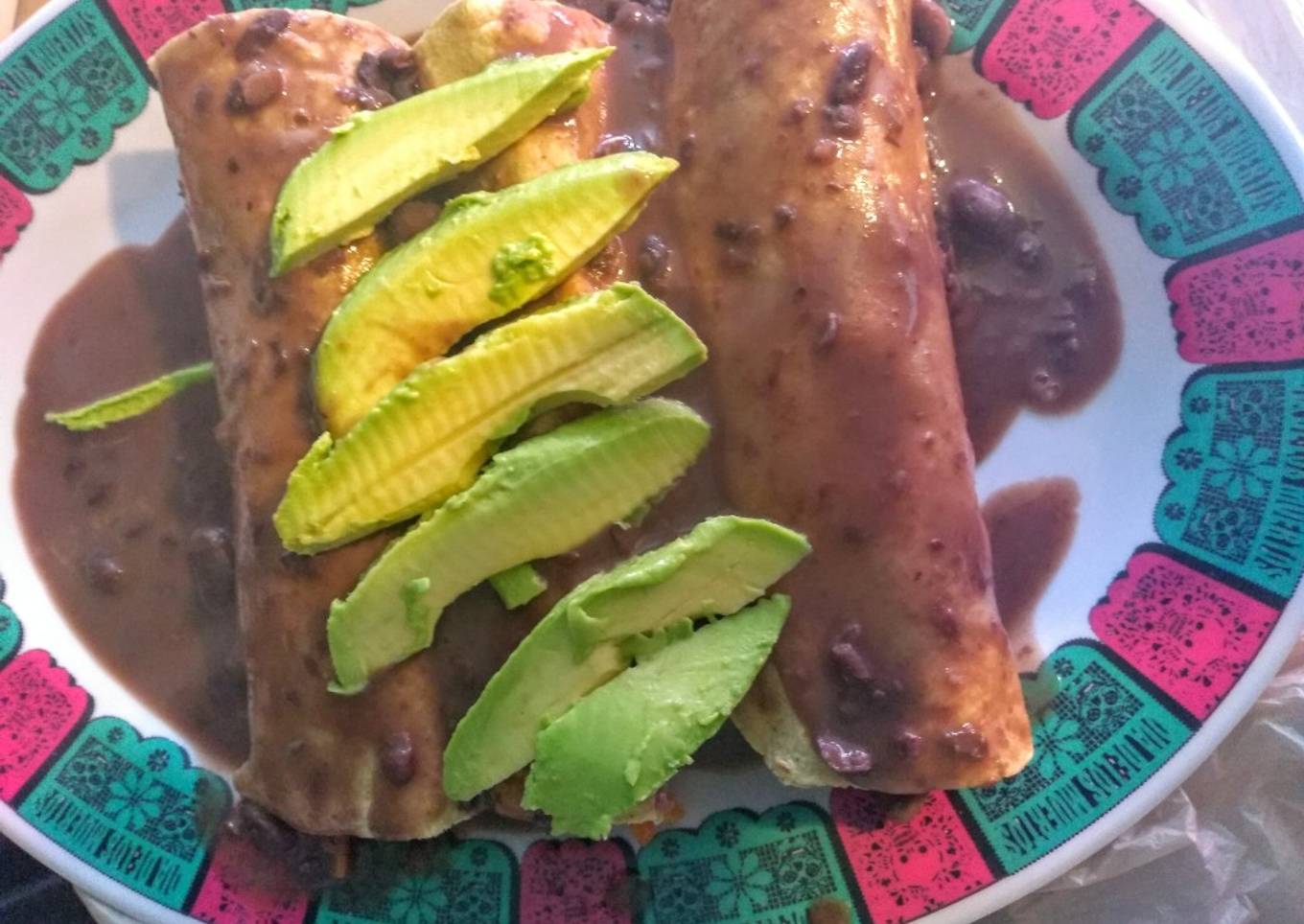 - Rellenamos las tortillas(calentadas en comal) con las verduras, haciendo taquitos. Ba帽amos las tortillas con la salsa de frijoles y acompa帽amos con aguacate por encima. 馃