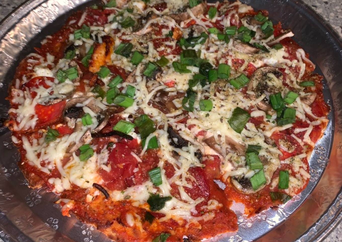 Pizza de pepperoni con setas y cebollines en masa de harina de almendras