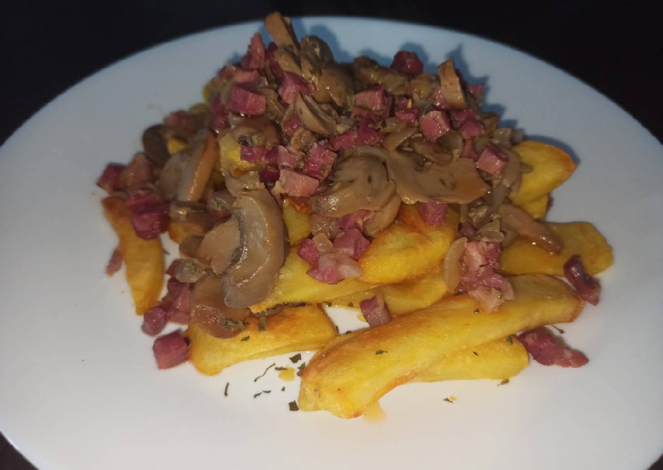 - Cuando esté listo todo ponemos una cama de patatas y por último los champiñones por encima.