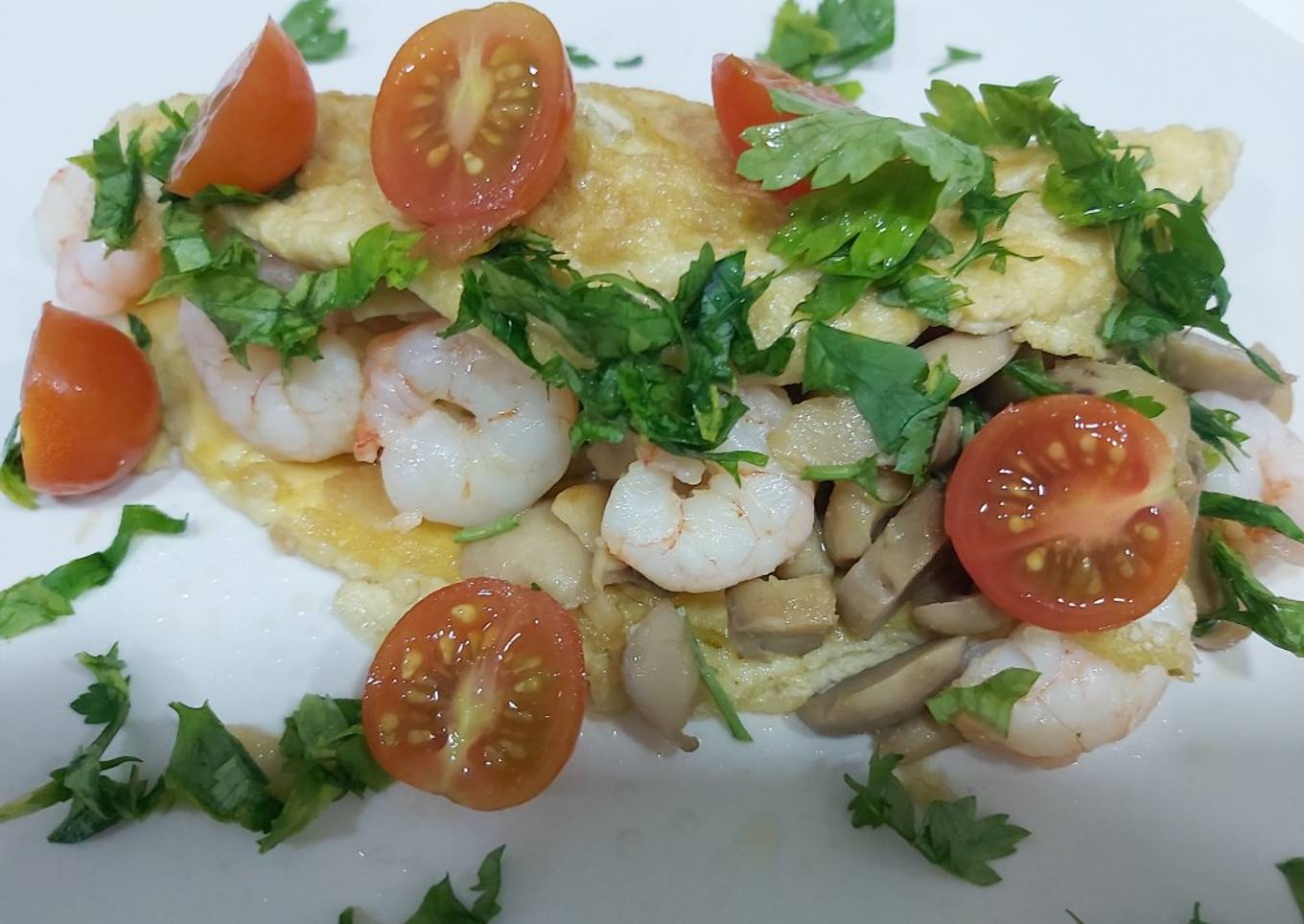 Steps to make to make Tortilla rellena, champiñones con gambas al ajillo....🦐🦐
