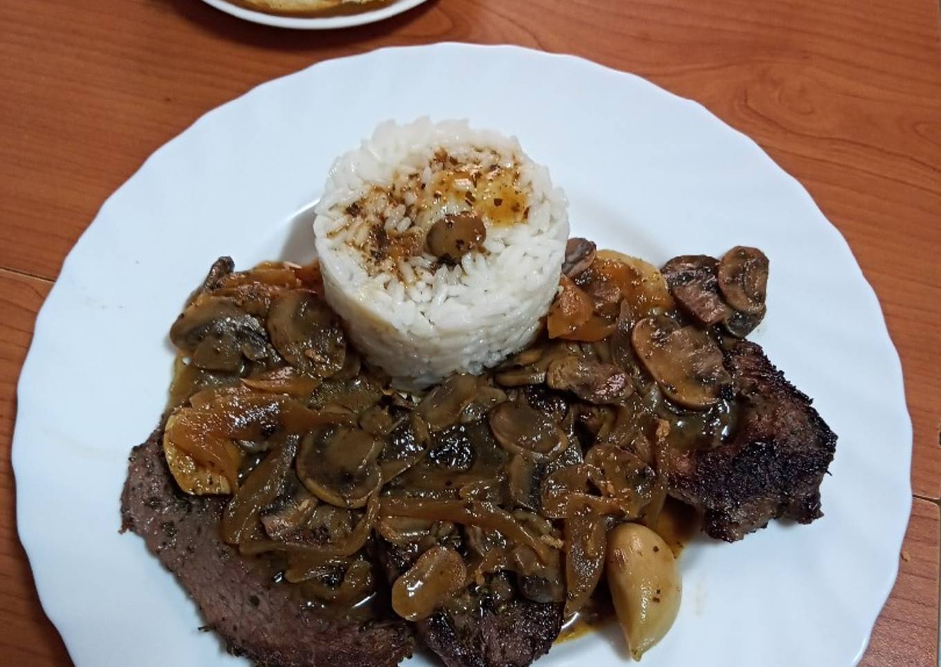 Filetes de ternera con champiñones al horno y arroz blanco