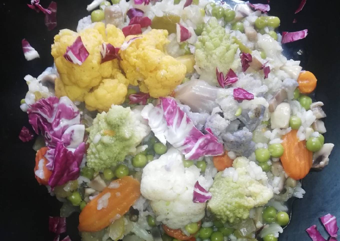 - Agregamos los champiñones cortados en trocitos, los guisantes y la coliflor cortada en ramilletes pequeños, y damos unas vueltas. Mojamos con el caldo vegetal y cocinamos diez minutos. Añadimos el arroz, mezclamos, y cocinamos once minutos más. Si hiciera falta se le añade más caldo poco a poco. Cuando el grano de arroz esté en su punto, apagamos el fuego, rectificamos de sal, y dejamos reposar cinco minutos más antes de servir. ¡ Buen Provecho !.