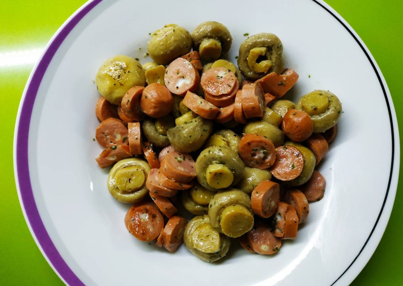 - Poner en una sartén con un poquito de Aove los champiñones escurridos y las salchichas en cachitos y añadirle sal y las especias.